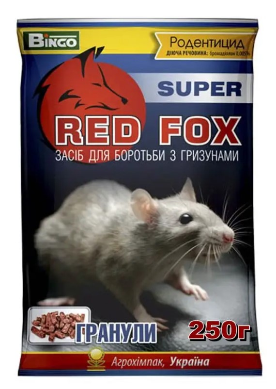 РЕД ФОКС супер – гранулированная приманка для борьбы с серыми и черными крысами, домовыми мышами, полевками и другими мышевидными и хомякообразными грызунами в среде жизнедеятельности человека. Средство предназначено для полного уничтожения популяций грызунов и профилактики их появления.