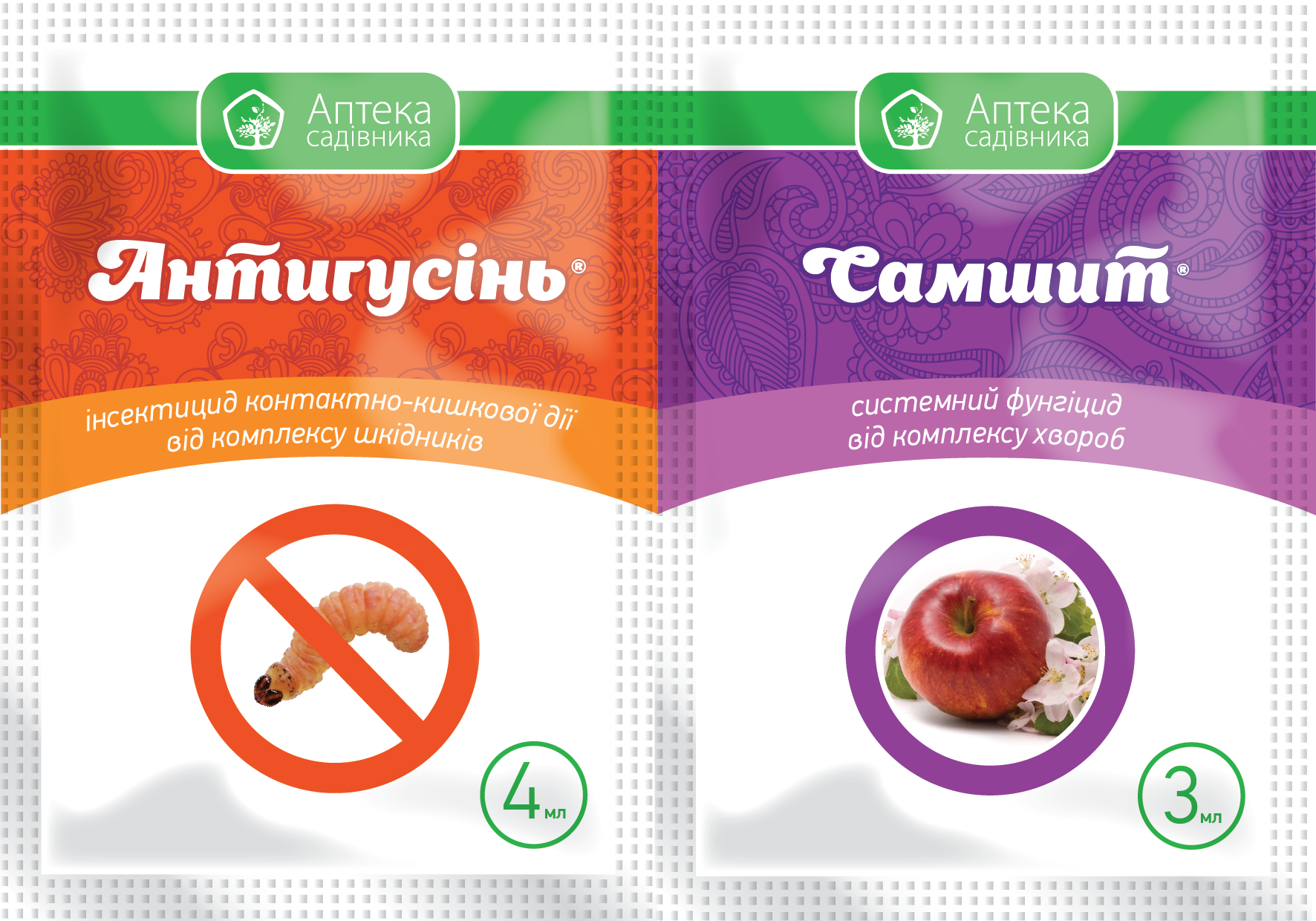 Антигусеница + Самшит – бинарный комплект инсекто-фунгицидного действия для одновременного контроля вредителей и болезней в насаждениях плодово-ягодных культур.