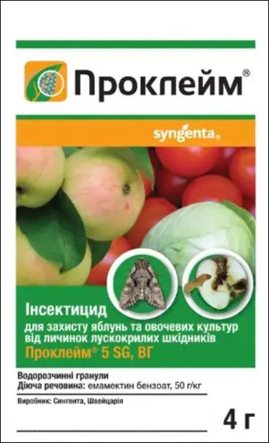 Проклейм® – новый инсектицид для защиты яблонь, овощных культур и винограда от всех чешуекрылых вредителей. Препарат быстро проникает в ткани растений (в течение 2 часов), но не оказывает системного действия. Там он содержится в виде микрорезервуаров в большом количестве. Благодаря быстрому проникновению растения эффективность действия препарата не зависит от высоких температур и осадков. Защитный период – до 2 недель. Действие препарата начинается с фазы яйца – прямое овецидное действие (при попадании на яйцекладку проникает через оболочку яйца и личинка погибает). В дальнейшем гибель личинок вредителей приводит к их питанию на обработанных растениях (питание прекращается через 1–4 часа, полная гибель наступает в течение 1–4 суток).