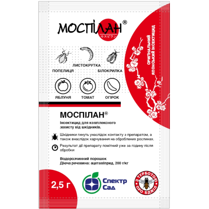 Моспилан - системный инсектицид контактно-желудочного действия против представителей семьи: чешуекрылых - Lepidoptera, полутвердокрылых - Hemiptera, трипсов - Thysanoptera, твердокрылых - Coleoptera и равнокрылых - Homoptera.