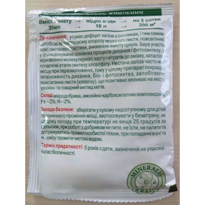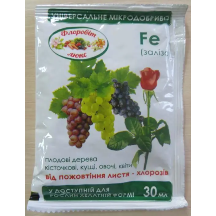 Универсальное микроудобрение Fe (железо) – устраняет дефицит железа в растениях, и тем самым предотвращает межлиственный хлороз молодых листьев, пожелтению всей листовой пластины, снижению содержания сахаров. Берет участие в функционировании основных процессов дыхания и фотосинтеза, в восстановлении молекулярного азота и нитратов к аммиаку, катализирует начальные этапы синтеза хлорофилла. Недостаток железа часто имеет место при переувлажнении, поэтому в целом препарат улучшает интенсивность дыхания, био- и фотосинтез, предотвращая пожелтение листьев (хлороза), что положительно влияет на качество урожая и внешний вид цветов.