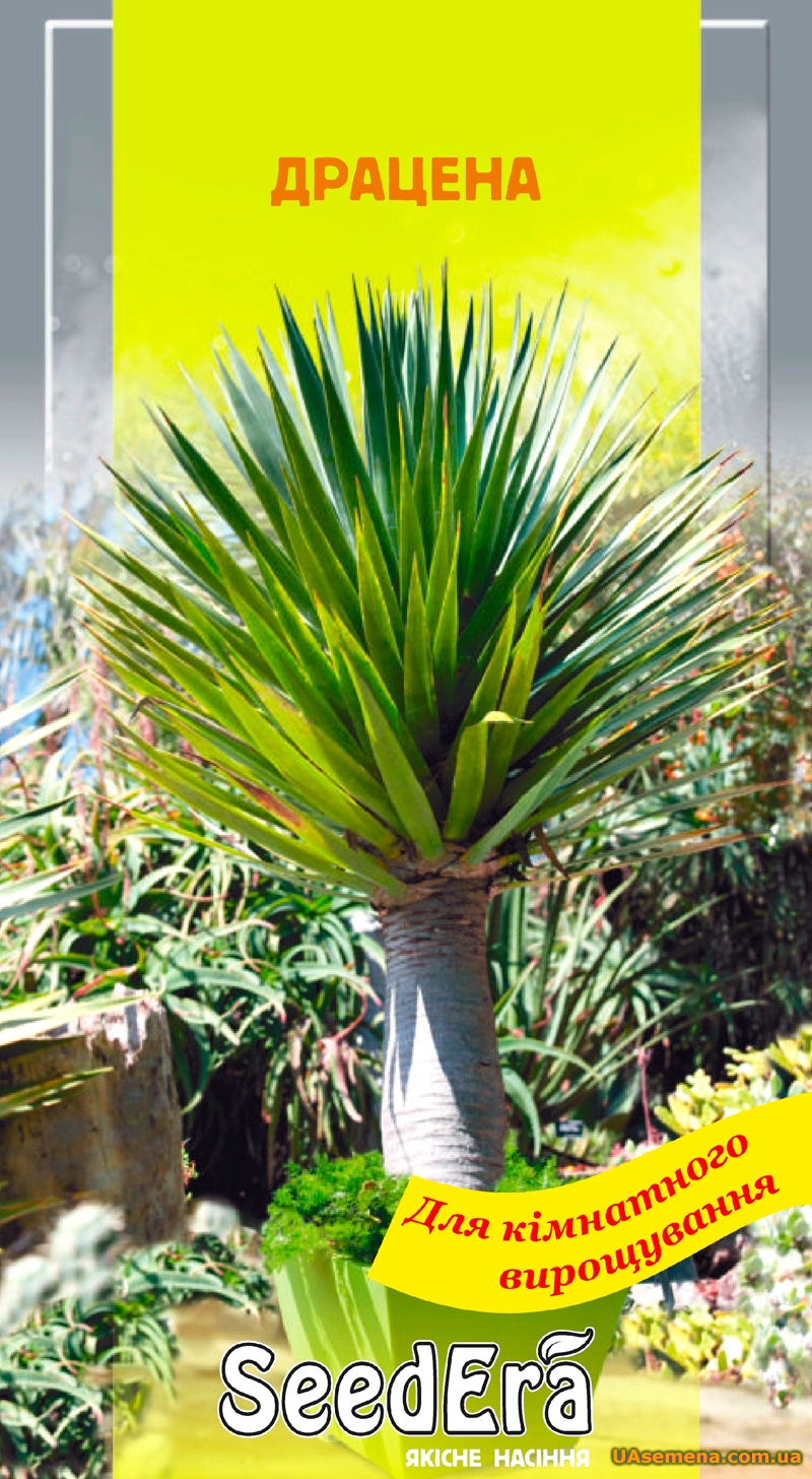 Невибаглива ефектна декоративно-листяна рослина Час життя: багаторічник Висота рослини: 100 см Невибаглива та відносно витривала в рослині горщика. Формує стовбур дерева висотою до 100 см, на вершині якого розташовується розетка довгого шаблевидного листя сіро-зеленого кольору зі світлими контрастними жилками. Перед посадкою насіння замочують на пару днів у стимуляторі росту, а потім промивають у проточній воді, сіють у березні у вологий субстрат, що складається з легкої дернової землі або торфу та піску в рівних частинах. Глибина загортання насіння 1,5-2 см. Краще відразу робити зайняв в окремий горщик, щоб потім не турбувати рослини. Насіння проростає через 30-35 днів після посіву, при Т 25-28 °С Посіви регулярно обприскують теплою водою і провітрюють, щоб сходи не загнили. Пікірування проводять, коли рослини досягнуть висоти 4-5 см в горщики діаметром 6-9 см з хорошим дренажем. Після пікірування температуру знижують до 23-25 ° С і тримають сіянці в добре освітленому місці. Рослина світлолюбна, але не переносить прямих сонячних променів. Ідеально підходить для офісних приміщень, зимових садів та засклених балконів. Висівають (місяць, глибина) – I-XII, 1,5-2 см