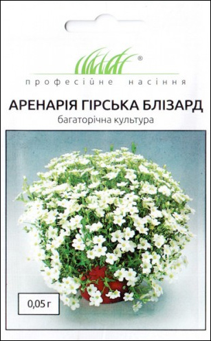 Аренарія монтана Блізард (Arenaria montana Blizzard Compact). Справжній прорив в селекції багаторічників. Формує кущики висотою 15-20 см, шириною близько 40 см. Блізард більш сильноросла серія, цвітіння на 2 тижні раніше порівняно з іншими сортами, компактний габітус, великі білі квіти. Термін вирощування після висадки в горщики 20-24 тижні.