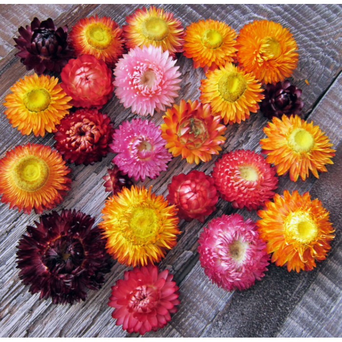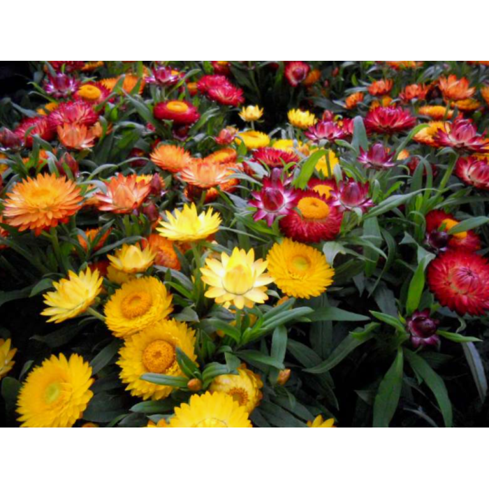 Геліхризум низькорослий — декоративна однорічна рослина із щільними, «солом'яними» суцвіттями, які зберігають форму та колір навіть після зрізання. У суміші представлені різні відтінки - жовті, помаранчеві, червоні, рожеві та білі тони, завдяки чому посадки виглядають яскраво та різноманітно.