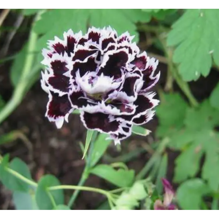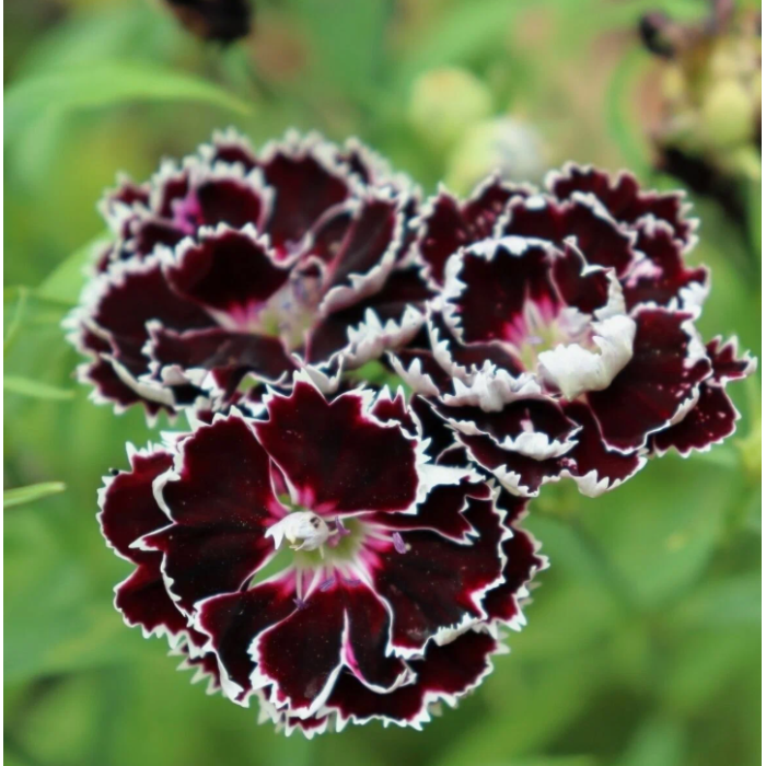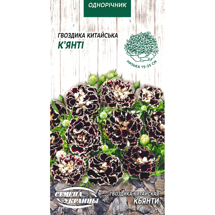 Гвоздика китайська сорту Кьянті - компактна декоративна рослина з насиченим, глибоким чорним відтінком квіток та білою облямівкою. Квітки акуратні, з різьбленими пелюстками, виглядають виразно навіть у невеликих посадках.