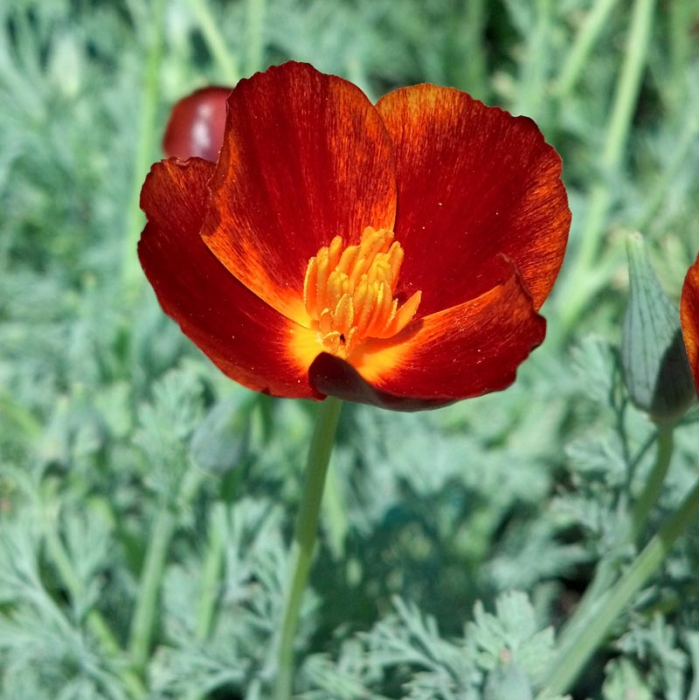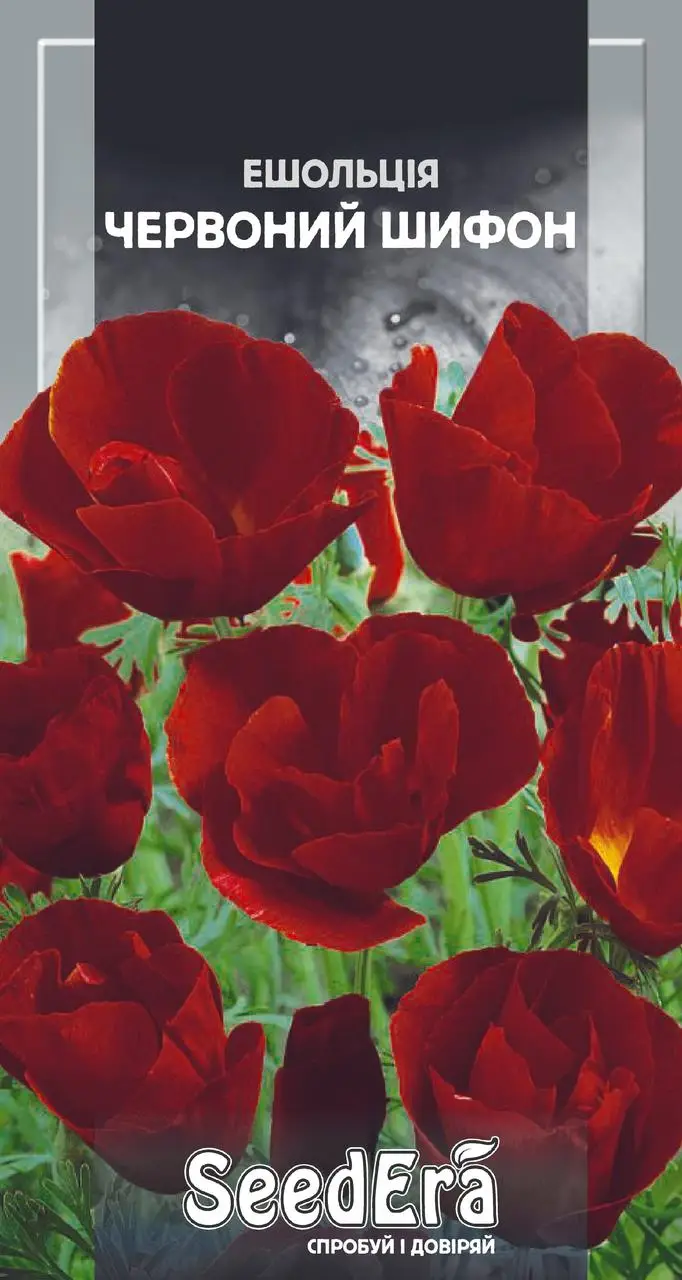 Каліфорнійська ешшольція Червоний Шифон — витончений однорічник з шовковистими чашоподібними квітками насиченого червоного кольору. Формує акуратні компактні кущики з ажурним сизо-зеленим листям. Квітки розкриваються на сонці, створюючи ефект яскравого «червоного килима» на клумбах, бордюрах та в рокаріях.