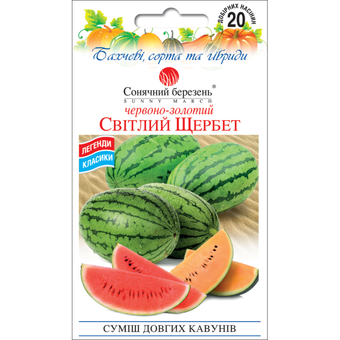 Кавун Світлий Щербет - незвичайна суміш довгастих кавунів зі світлою, ніжно-зеленою шкірочкою, прикрашеною темно-зеленими цятками, які збираються в нерівні смуги. На вигляд плоди відразу виділяються серед класичних кавунів, а за смаком — тим більше.