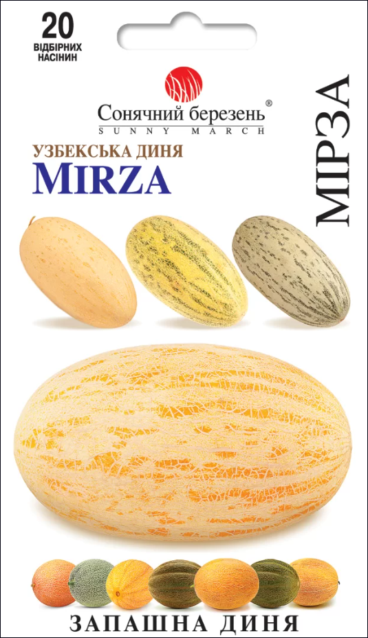 Диня Мірза (перекладається як Принц або Високий Дворянин), вирощується в Узбекистані з давніх-давен (не менше трьох століть). Це великі дині, від ЗО до 60 сантиметрів у довжину та до 11 кг у вазі, подовженої овальної форми із загостреними вигнутими кінцями. Поверхня дині тверда, покрита частою текстурованою сіткою. Дині Мірза мають солодкий та пікантний мускусний смак, їх традиційно вживають у їжу прямо з рук, у сезон динь, їх люблять за ніжний, соковитий та солодкий м'якуш, подають як закуску до чаю або, як десерт. В Узбекистані ці дині збирають перезрілими, для нарізування та сушіння на сонці. Рослини цього сорту вимагають багато тепла та світла, але ця диня вже багато років вирощується в Україні, зберігаючи свої традиційні якості.