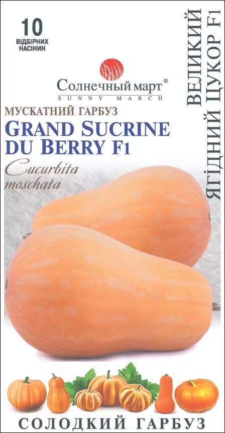 Новий гібрид великого мускатного гарбуза, створений на основі старовинного французького сорту Sucrine du Berry з Беррі (район Валь-де-Луар), який був заново відкритий у 80-х роках. Це різновид гарбузового горіха, зимового гарбуза, який можна довго зберігати (6-8 місяців). Плід грушоподібної форми, спочатку темного зеленого кольору, який сяє доти, доки не стане жовтим, і нарешті, помаранчевим при повному дозріванні через 90 днів після сходів. Довгоплетиста рослина виробляє до 5 плодів на лозі, вага яких досягає 10 кг. «Солодка ягода» має м'якуш дуже гарного яскравого помаранчевого кольору, ніжний, м'який та солодкий, не борошнистий. Смак із тонкими нотками дині, кориці та ванілі! Плоди можна збирати, коли вони ще не дозріли, вони добре дозрівають у процесі зберігання, без втрати якості. Цей гарбуз ідеально підходить до гратену, картопляного пюре, супів, пирогам, заварному крему, джему, відмінно смажиться і запікається.