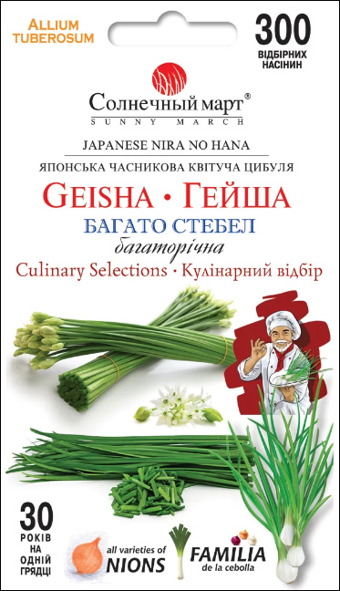 Geisha – це часникова цибуля з особливо великим і смачним листям, яке покривається красивими білими квітами на довгих квітконосах, які приваблюють метеликів у пізній осінній сад. Довго не бажаючи цвісти, цей сорт дає більш тривалий, ніж у багатьох інших, сезон збору великого, широкого і плоского, тонкого і елегантного листя. Рослини подвійного призначення, як харчового, так і як прикраса саду. Коли Гейша зацвітає, хоча пізнє цвітіння – це добре для трав, мешканці Вашого саду – метелики будуть дуже щасливі! Ці білі квіти у формі зірки метелика вважають чарівними. Їстівна та декоративна, приправлена ідеальним смаком часнику, Гейша – це красуня в саду та на смак.