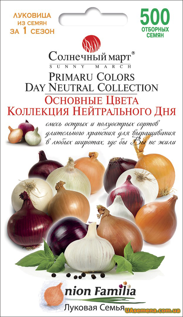 Широка лінійка повнорозмірних луків нейтрального дня для всіх денних адаптацій на території України. Це суміш гострих і напівгострих сортів тривалого зберігання для вирощування в будь-яких широтах, де б Ви не жили, яка може забезпечити достатній запас цибулі протягом року. Вибравши правильний тип цибулі для вашого регіону, ви отримаєте здорове розвинене зелене листя, яке досить велике для утворення великих і смачних цибулин. Цибуля нейтрального дня утворює цибулини незалежно від кількості годинників денного світла і добре росте практично в будь-якому регіоні. Ця суміш включає три основні кольори цибулі: Червоні, від бронзових до фіолетово-вишневих, Жовті, від блідо-солом'яних до золотисто-коричневих. Білих, від прозорих до сріблястих (представлених у невеликій кількості, оскільки цей тип цибулі є солодким салатним та не призначений для тривалого зберігання). Всі цибулі з трьох кольорів середньо-пізні, швидко і дружно ростуть (близько 120-140 днів), виробляючи хороший урожай твердих, великих цибулин, що хрусткі, з блискучою багатошаровою оболонкою.