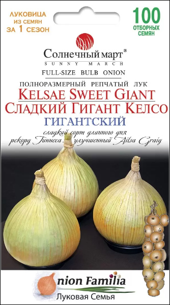 Солодкий гігантський лук Kelsаe є світовим рекордом Гіннеса за величиною найбільшої цибулі у світі, його вага становить 15 фунтів 5,5 унцій і діаметр 33 дюйми! Зробіть враження на ваших сусідів і спробуйте виростити цибулю розміром зі світовий рекорд. Цей сорт сімейної реліквії з'явився в Шотландії в 1950-х роках внаслідок багаторічних відборів із старовинної цибулі Ailsa Craig (1887). Сорт довгого дня, що добре росте у північних регіонах (100 днів від висадки розсади). В умовах України набирає ваги близько 1 кг. Це класична, високоякісна м'яка цибуля з розміром від гігантської до колосальної. Цибулини круглі до краплевидних із золотистою шкірою. Тверда, з м'яким солодким м'якушем та насиченим ароматом, цибуля тонкої текстури, відмінно підходить для салатів, бутербродів та заморозки. Має досить добрий потенціал короткочасного зберігання.