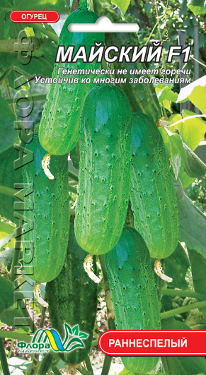 Бджолозапильний, ранній, переважно жіночого типу цвітіння гібрид (вимагає 10-15 % рослин сортів-запилювачів). Рослина сильноросла. Головний батіг довгий, розгалуження середнє і слабке. Дуже дружня віддача врожаю в перший місяць плодоношення - 15 кг/м2. Плоди циліндричні, горбкуваті, зелені або світлі зелені, білоопушені, довжиною 13-15 см, масою 130-200 г, доброго смаку. Салатний, але придатний для засолу з короткочасним терміном зберігання. Перевага гібрида "Травневий F1" - можливість отримання раннього врожаю в захищеному ґрунті. Стійкий до вірусу огіркової мозаїки, відносно стійкий до борошнистої роси та прикореневим гнилям.
