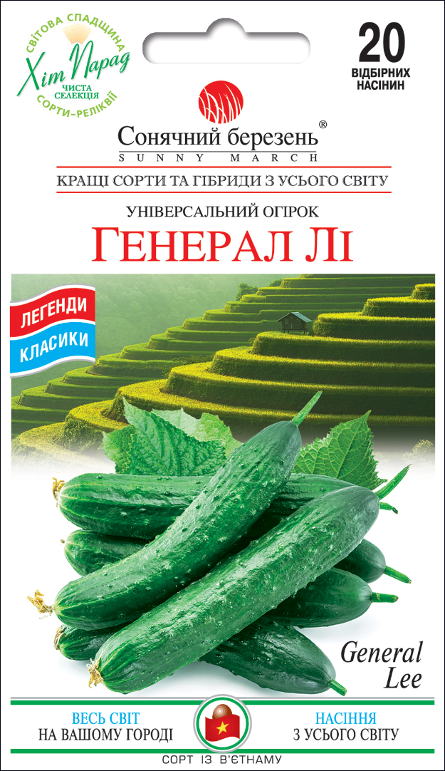 Цей традиційний в'єтнамський сорт міцно утвердився як один із «великих» у світі огірків, ставши основою для багатьох американських та європейських гібридів. Він є стандартом салатного огірка завдяки своєму чудово свіжому, солодкому смаку, хрумкій текстурі та м'якому аромату. Високоврожайний сорт, дуже стійкий до хвороб, що робить його чудовим для ранніх і пізніх посівів. Універсальний і витривалий, цей огірок має велику вагу в азіатській кухні, відрізняючись від західних сортів видовженою формою, рідкою горбкуватою тонкою шкіркою і меншою насіннєвою порожниною. Генерал Лі – це красивий темний зелений огірок, який збирають у розмірі 6–8 дюймів (15-20 см) приблизно через 50 днів після сходів. Плоди зберігають свій розмір і форму навіть за поганих погодних умов, на відміну від інших сортів, які можуть скручуватися і деформуватися, тоді як ці 5-фунтові (1,5 м) довгі лози продовжують зав'язувати огірки для регулярного збору. Неперевершений смак.