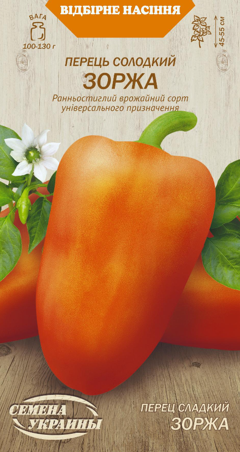 Ранній сорт. Період від сходів до початку стиглості 100-110 днів. Кущі висотою 45-55 см. Плоди середнього розміру, масою 100-130 г, призмовидної форми, помаранчевого забарвлення. Товщина стінок 7-9 мм. Без ГМО.... Читати далі...
