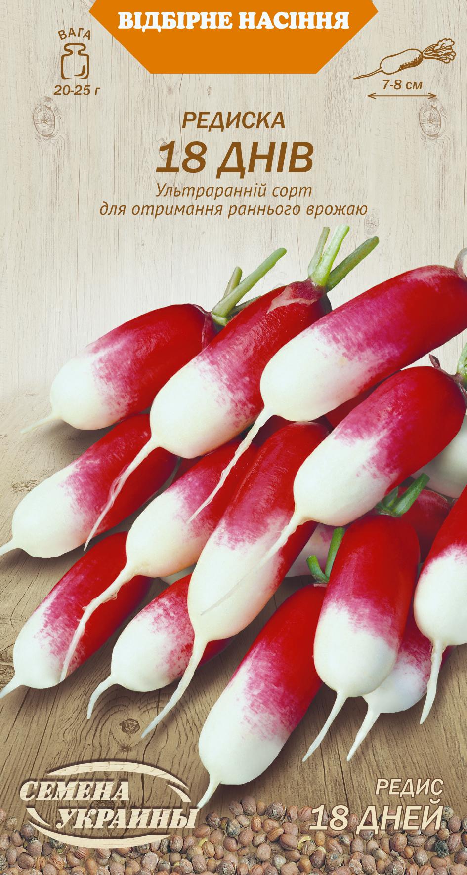 Ультраранній сорт. Період від сходів до дозрівання 18-22 дні. Коренеплоди невеликі, видовженної форми, довжиною 7-8 см, масою 20-25 г, червоного кольору з білим кінчиком. Без ГМО.... Читати далі...