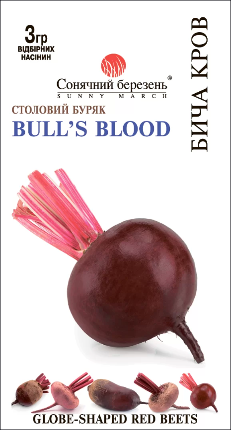 Красивий і смачний універсальний буряк, пофарбований від червоного до темного фіолетового з листя до коріння. Старовинний сорт Бича Кров спочатку вирощувався через його темне червоне ніжне гофроване листя, а коренеплоди збиралися, як другорядна культура. У наші дні Bull's Blood вирощують, як особливий сорт, використовують як листя, так і повнорозмірний буряк, який за популярністю перевершив зелень. Коренеплоди близько 10-15 см у діаметрі, округло-плескатої форми. Шкірка трохи шорстка, темна червона, міцна. Насичений темний фіолетовий м'якуш має чудовий землистий, солодкий та горіховий смак. Молоду зелень збирають через 35 днів, а на буряк потрібно чекати 50-60 днів. Він чудово зберігається всю зиму.