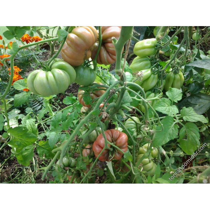 Популярний великоплідний середньостиглий сорт (90-100 днів). Формує чудові ребристі плоди коричневого кольору. М'якуш коричневий, щільний, відмінного солодкуватого смаку. Рослина потужна, сильноросла (індетермінантна). Кущ досягає висоти більше 1,5 метрів і вимагає підв'язки. На головному стеблі формується 4-5 китиць, в китиці до 5 плодів. Плоди великі, салатного призначення та для переробки. Вирощують переважно через розсаду. Збирання по мірі дозрівання плодів.