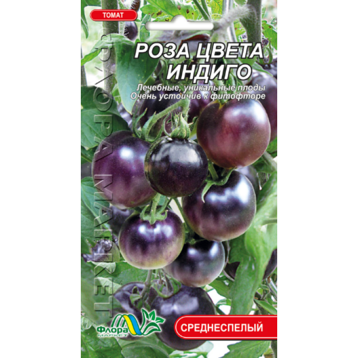 «Indigo Rose» - середньостиглий китицевий сорт іноземної селекції з серії чорних томатів. Відрізняється великою користю і лікарськими властивостями плодів. Кущ до 1,2 м, стрункий, малооблистнений. Сорт урожайний, смак стиглих плодів хороший, солодкий, м'якуш червоний. Плоди ростуть невеликими китицями і майже повністю пофарбовані в фіолетовий колір. Маса плоду 35-70 г. Формувати найкраще в 1-2 стебла. Феноменально стійкий до фітофтори. Використання універсальне.
