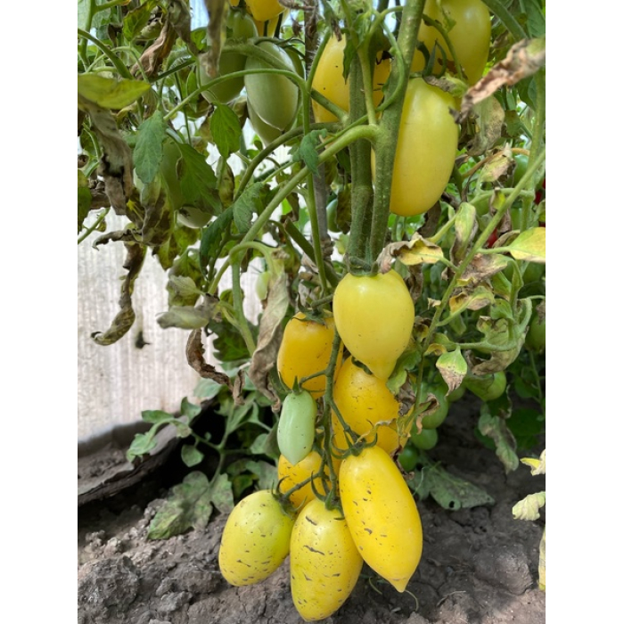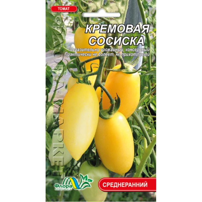 "Кремова сосиска" (Cream Sausage) ранній, детермінантний сорт (80-110 днів). Кущ 60-80 см, в теплиці до 1-1,2 м (пасинкують до першої китиці). Вражаюче урожайний, продуктивний сорт! Плоди сливоподібні, консервного призначення. Всі томати вирівняні, приблизно одного розміру і форми, вагою 100-130 г, не дрібніють до кінця врожаю. Колір зрілих плодів жовтий. Смак м'який, томатний. Шкірочка тонка, міцна - плоди довго зберігаються після збору і не лопаються при консервації. Дає врожай за будь-яких погодних умов. Практично не хворіє (слабо вершинної гниллю).