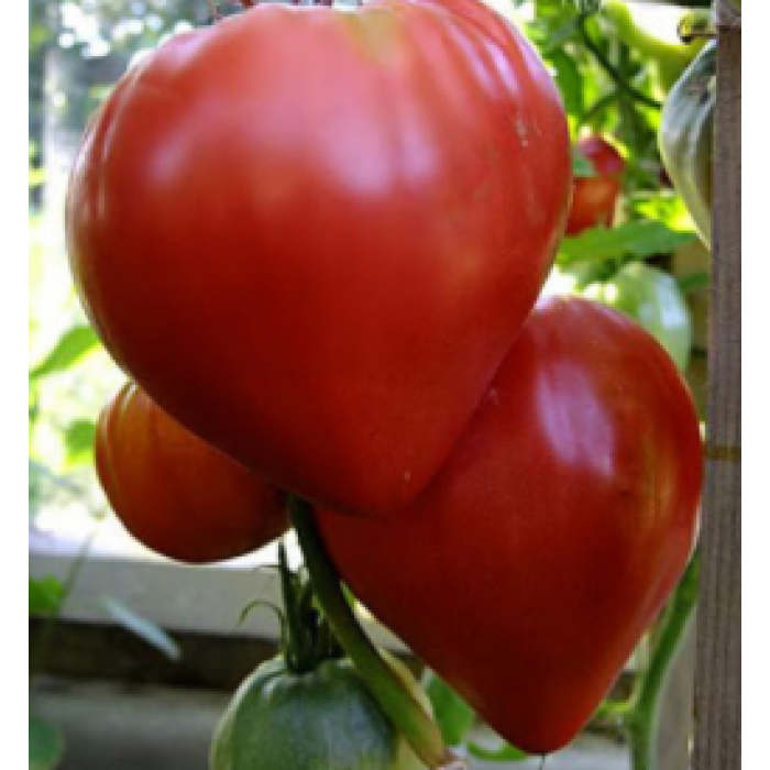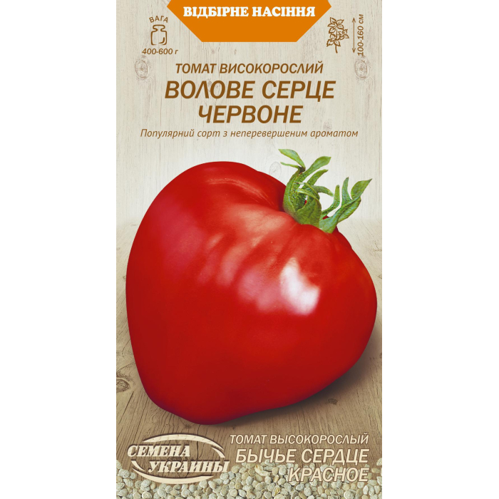 Середньостиглий сорт. Період від сходів до початку дозрівання 110-120 днів. Кущ високорослий, у відкритому ґрунті 100-160 см. Плоди великі, серцеподібної форми, масою 400-600 г, червоного забарвлення. Без ГМО.... Читати далі...