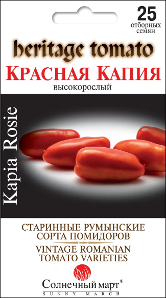Румунські помідори вважаються найкращими у світі за смаком, завдяки тривалому відбору, як старовинні місцеві сорти, що збереглися незмінними до наших днів. Індетермінантний середньостиглий (110-120 днів) кистьовий сорт. Помідори ростуть віялоподібними гронами по 6-8 плодів у кожній. Кущ потужний, заввишки близько двох метрів. Плоди довгі, перцевидної форми. Капія, яскравого червоного кольору, вагою близько 150 г. М'якуш дуже м'ясистий, мапосім'яний, ароматний, з відмінним смаком. Ці помідори дуже універсальні у використанні, вони чудові свіжими, їх консервують і солять, готують пасту та сушать, а при заморожуванні вони стають ще смачнішими.