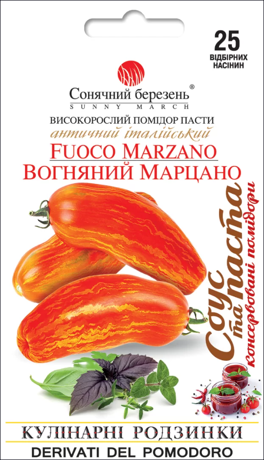 Fuoco Marzano - це «традиційний» старовинний помідор з усіх томатів пасти. У нього характерні стислі плечі, які є типовими для всесвітньо відомих помідорів типу Сан Марцано, вирощених в Італії. Як і помідори Сан Марцано, сорт Вогненний Марцано наповнений чудовим м'ясистим густим м'якушем, а кулінарна обробка надає їм неймовірного смаку. Fuoco Marzano - це завжди чудовий ароматний томатний соус, він чудовий у всіх видах консервування, але це ще й чудовий смажений помідор. Їх нарізають на смужки та підсмажують на повільному вогні для посилення смаку. Після приготування смажені смужки додаються до страв з макаронних виробів аналогічно в'яленим помідорам. Рослини компактні та напівдетермінантні (до 1 метра), обвішані кистями з п'ятьма довгастими плодами 5-7 см завдовжки, вагою близько 100 грамів, що дозрівають до яскравого червоного кольору з блискучими хвилястими смужками помаранчевого та жовтого, через 75 днів після пересадки.