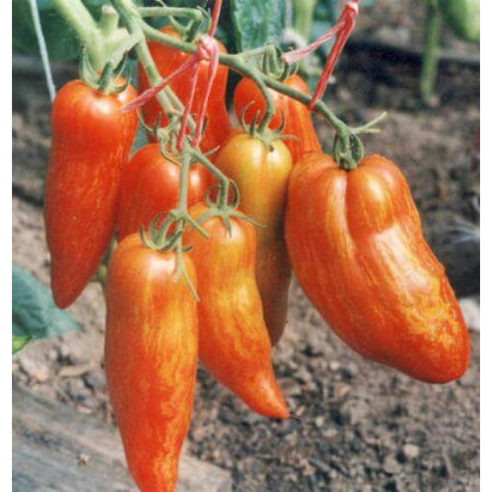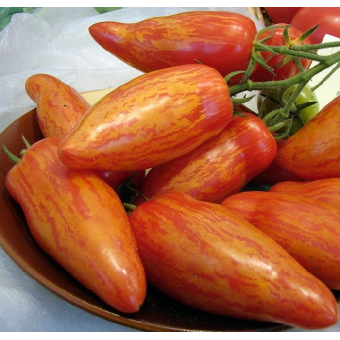 Приголомшливі та унікальні, ці перцевидні, гострі, червоні помідори прикрашені хвилястими помаранчевими смугами! Отриманий від випадкового схрещування сортів Antique Roman (Античний Римський) та Banana Legs (Бананові ног... Читати далі...