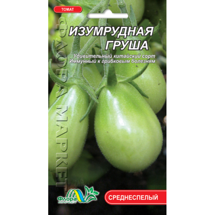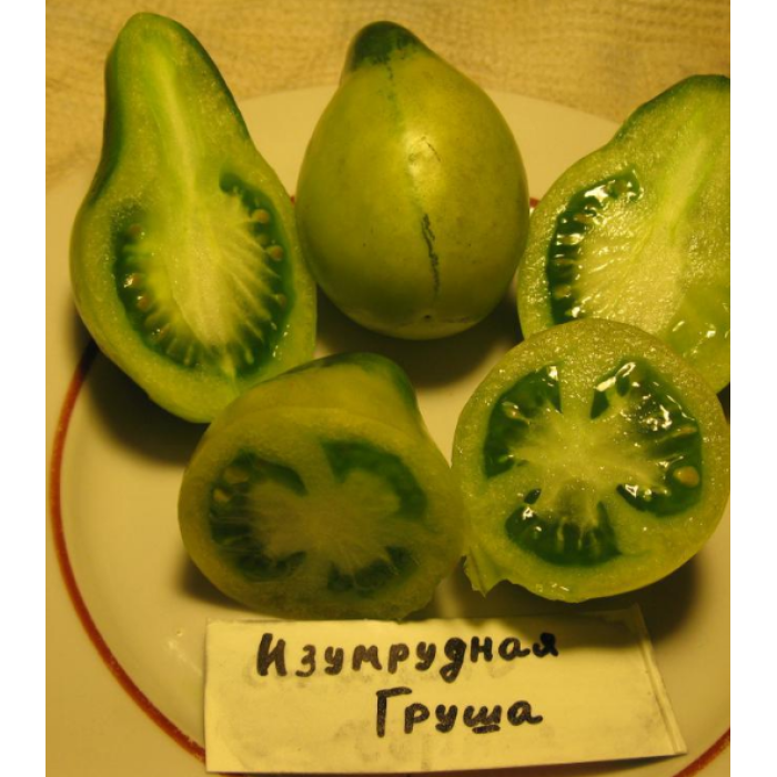 Сорт томата «Смарагдова груша" родом з Китаю. Кущ індетермінантний, добре облистнений з безліччю пагонів і висотою до 2 м, однак завдяки підвищеній стійкості до захворювань сорт можна вирощувати без опор - в розстил. Плоди незвичайної грушовидної форми і оригінального зеленого (іноді з жовтизною) кольору в стиглому вигляді. Томати гладкі, вирівняні за величиною, з ніжною еластичною шкіркою, масою 100-170 г, не розтріскуються і не гниють навіть після дощів. Смак зрілих плодів солодкий, нагадує вишукані фрукти. Сорт відмінно зав'язує плоди при різних температурах, добре дозріває в кімнатних умовах і має високу лежкість плодів при зберіганні. Урожайність - до відра з куща на родючих ґрунтах! Призначення - салатний і для цільноплодного консервування.
