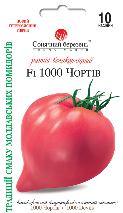 Томат 1000 Чортів F1 – високоурожайний гібрид з характерними червоними плодами та яскравим смаком. Це індетермінантний сорт з компактним ростом, який ідеально підходить для вирощування у відкритому ґрунті, теплицях і навіть на балконах. Вегетаційний період становить 95–100 днів.