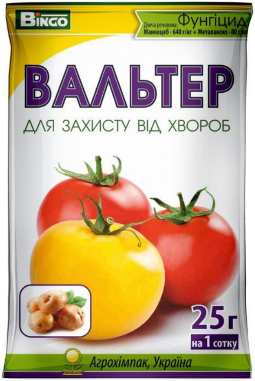 Вальтер — комбінований фунгіцид системної та контактної дії для захисту овочевих (томати), технічних (картопля) культур від комплексу хвороб: фітофтороз, альтернаріоз, переноспороз. Металаксил, що є у складі препарату, швидко поглинається і розповсюджується всередині рослини, пригнічує поширення хвороби та захищає молодий приріст від ураження, а манкоцеб створює на поверхні рослини захисну плівку, що перешкоджає проникненню спор та проростанню нових конідій гриба.