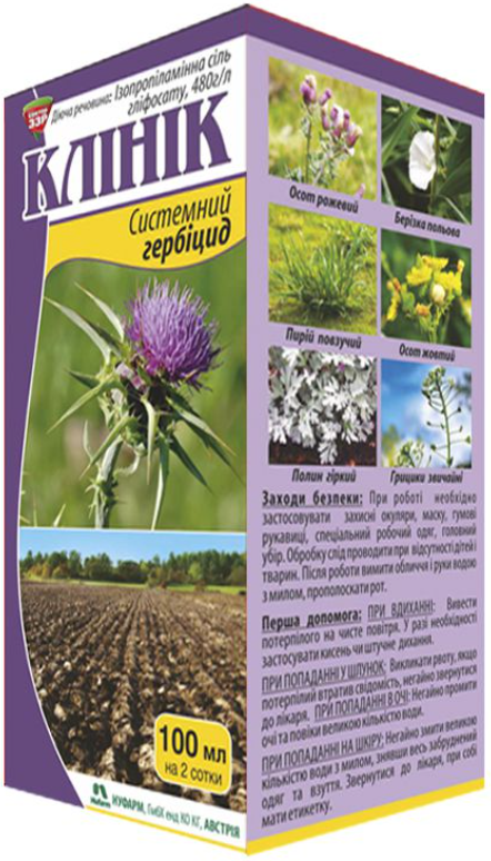 Клінік - системний післясходовий гербіцид суцільної дії для боротьби з широким спектром однорічних і багаторічних злакових та дводольних бур'янів. Препарат поглинається листям та зеленими пагонами бур'янів протягом 4-6 годин після обприскування, розноситься по всіх органах, в тому числі і до кореневої системи. Клінік порушує синтез рослинного ферменту, руйнує механізм метаболізму, блокує дихання та фотосинтез, внаслідок чого рослини гинуть.