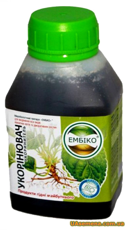 ЭМБИКО "УКОРЕНИТЕЛЬ" - высококачественное, многокомпонентное удобрение, специально созданное для всех видов комнатных цветов и декоративных растений, а также для рассады овощных и ягодных культур нуждающихся в лучшем укоренении.ПРЕИМУЩЕСТВА ЭМБИКО:. Уникальное соотношение микроорганизмов, макро - и микроэлементов, витаминов,. Полноценный состав удобрения положительно влияет на образование, развитие и укрепление (если она ослаблена) корневой системы растений и рассады,. Регулярное применение удобрения обеспечивает наилучшие условия интенсивного разрастания и облегчает адаптацию растений и рассады после посадки,. Уникальный фунгицидный эффект,. Благодаря своей специфике, удобрение характеризуется эффективностью, экономностью и легкостью в использовании,. Эффект от жидких удобрений наступает быстрее, чем при внесении их в сухом виде,. Жидкие удобрения самые эффективные, так как разводятся в воде, полив и подкормка производятся одновременно,. Устойчивость к болезням и вредителям,. Улучшение приживаемости посадочного материала,. Защита саженцев и черенков от загнивания,. Улучшение восприятия минеральных элементов питания,Удобрение не фитотоксично, безопасно для человека, животных, птиц.