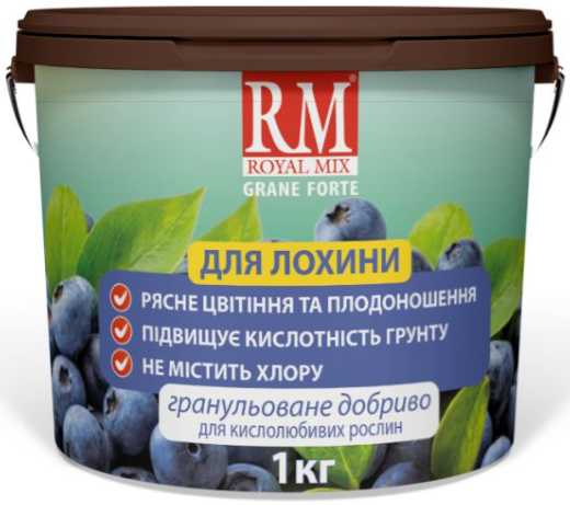 Призначено: Royal Mix Grane Forte високоякісне, гранульоване мінеральне добриво, розроблене спеціально для підживлення лохини, чорниці, азалій, рододендронів та інших кислолюбивих рослин.