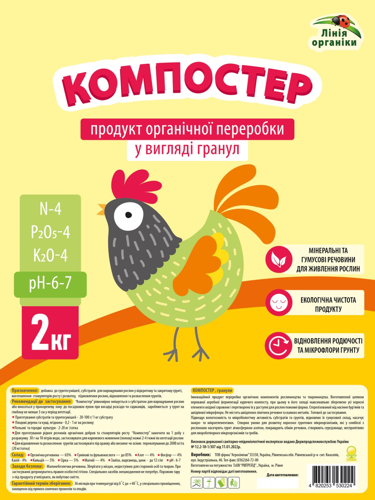Інноваційний продукт переробки органічних компонентів рослинництва та тваринництва. Виготовлений шляхом керованої аеробної ферментації курячого компосту, при цьому в його складі максимально збережено усі корисні елементи вхідної сировини і перетворено їх у доступні для рослин поживні форми. Стерилізований від насіння бур'янів та шкідливої мікрофлори. Не містить шкідливих хімічних речовин та важких металів. Готовий до застосування.