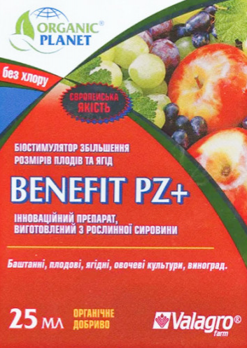 Benefit PZ плюс – біостимулятор, розроблений для збільшення маси та розміру, покращення однорідності плодів садових культур, їх кольору та смакових якостей (для кращого ефекту застосовувати з Максікроп Крем). Підживлення Бенефітом на початку цвітіння покращує поділ клітин, як результат, збільшує їхню кількість в кожному окремому плоді (щільність).